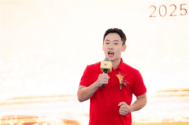 掌声未落,一场充满力量的誓师仪式紧接着展开。郎酒兼香事业部销售团队整齐列队,齐声高呼“郎酒兼香、龙马奔腾”。邹凯将一面象征使命的旗帜授予团队,旗面飘扬的瞬间,现场气氛达到顶点。这场面,已不仅是一次品牌活动,更像是一场出征前的动员。