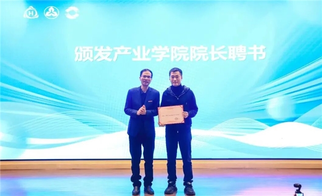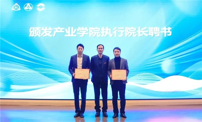 丁金昌为方剑颁发产业学院院长聘书,为李信赢、欧阳驹颁发执行院长聘书。