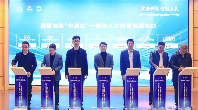 五所中职学校领导与院校、协会代表共同签约,成立直播电商“中高企”一体化人才共育联盟,构建起贯通式人才培养通道。