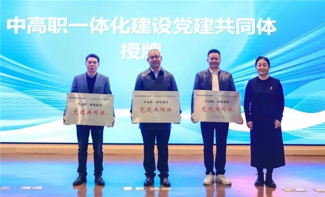 谢鑫为三所中职学校授“中高职一体化建设党建共同体”牌匾,以党建引领人才培养协同发展。
